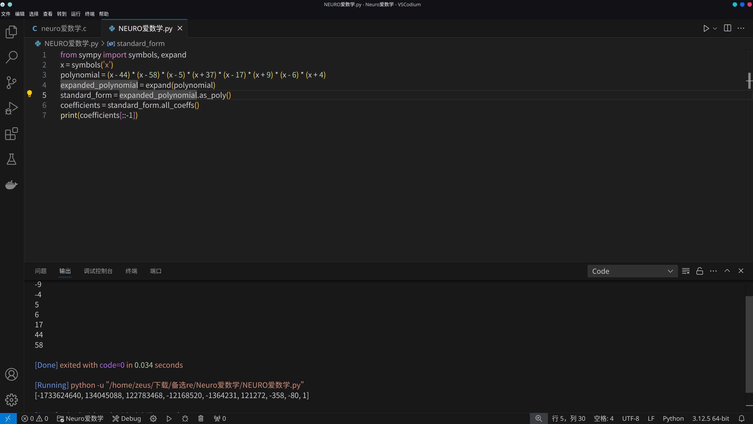 程序要求用户输入9个整数,存储在 coeffs 数组中。使用这9个整数作为系数,构造一个8次多项式。然后在整数范围 [-60, 59] 内对这个多项式进行求值。对于每个 i 从 -60 到 59:初始化 total = 0 和 power = 1,对每个系数 j 从 0 到 8,然后: